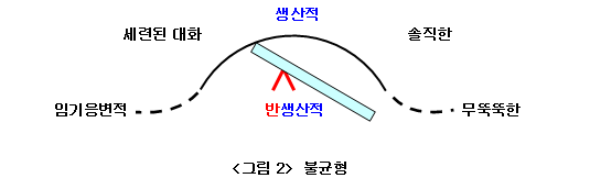 <그림 2>에서 보듯이 <솔직한>이 <세련된 대화>보다 훨씬 더 무겁고 그래서 저울은 <무뚝뚝한> 쪽으로 기울어 반생산적 영역으로 빠진다.